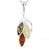 blad bärnsten halsband i silver med hängen i silver med blank yta och 3 facettslipade multifärgat bärnstenar.