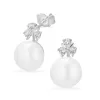 blommor pärla örhängen i silver med blank yta och 6 facettslipade vita zirkoner 2 vita sötvattenspärlor.
