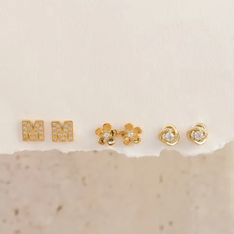 bokstav m örhängestift i förgyllt silver med blank yta och facettslipad vit zirkon.