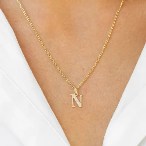 bokstav n zirkon hängen i 9 karat guld med blank yta og facettslipad vit zirkon.