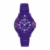 barnklocka från barnklocka modell A65163PU10A med urtavla av lila metallic, självlysande siffror och visare.