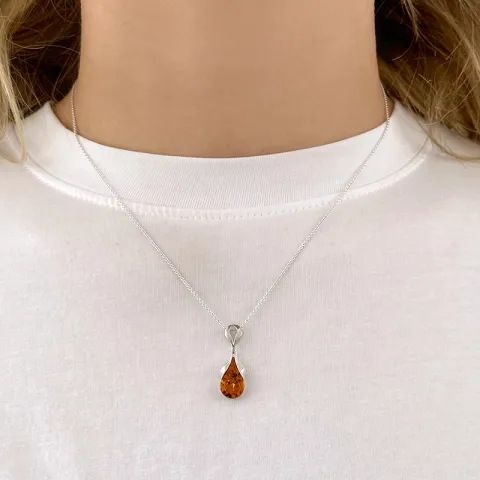 elegant droppe bärnsten hängen i silver med blank yta og 1 cabochonslipade rödbrune bärnstenar.
