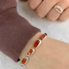 fyrkantigt bärnsten armband i silver med blank yta och cabochonslipat rödbrun bärnsten.