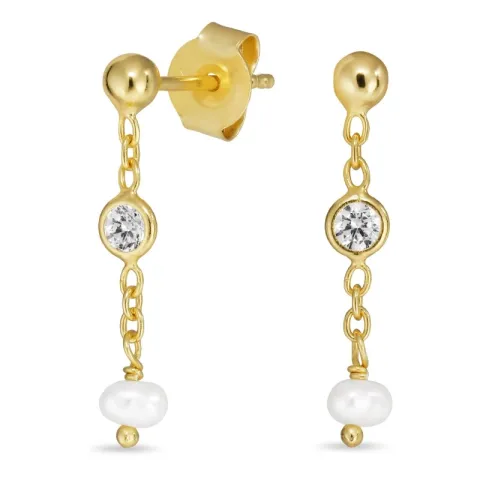 vit zirkon kedja örhängen i förgyllt silver med blank yta och 2 facettslipade vita zirkoner 2 vita pärlor.