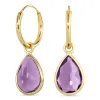 droppe lila kristal creol i förgyllt silver med blank yta och 2 slät lila kristaller.