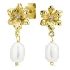 örhängen i förgyllt silver med blank yta och facettslipad vit zirkon 2 vita syntetiska pärlor.