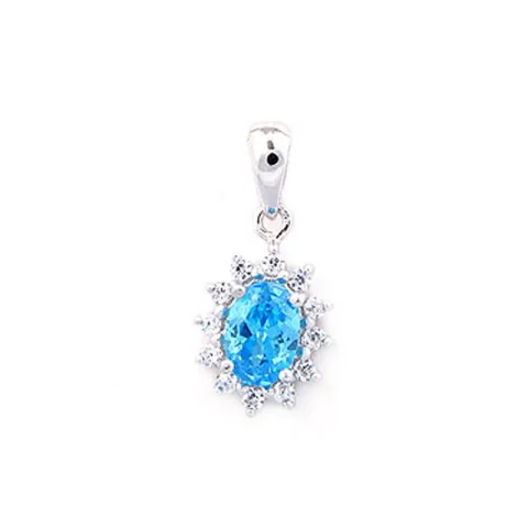 rosett hängen i rhodinerat silver med blank yta og 1 facettslipade blå zirkoner og facettslipad vit zirkon.