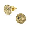 runda örhängen i förgyllt silver med strukturerad yta och 1 slät blå nanoglas och 1 facettslipade lila zirkoner och 1 slät gröna nanoglas.