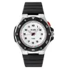 Klockan har ett armband av sort gummi.