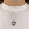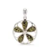 runt bärnsten hängen i silver med blank yta og 5 cabochonslipade gröna gröna bärnstenar.
