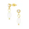 vattentät pärla örhängen i förgyllt stål med blank yta och 2 facettslipade vita zirkoner 2 vita syntetiska pärlor.